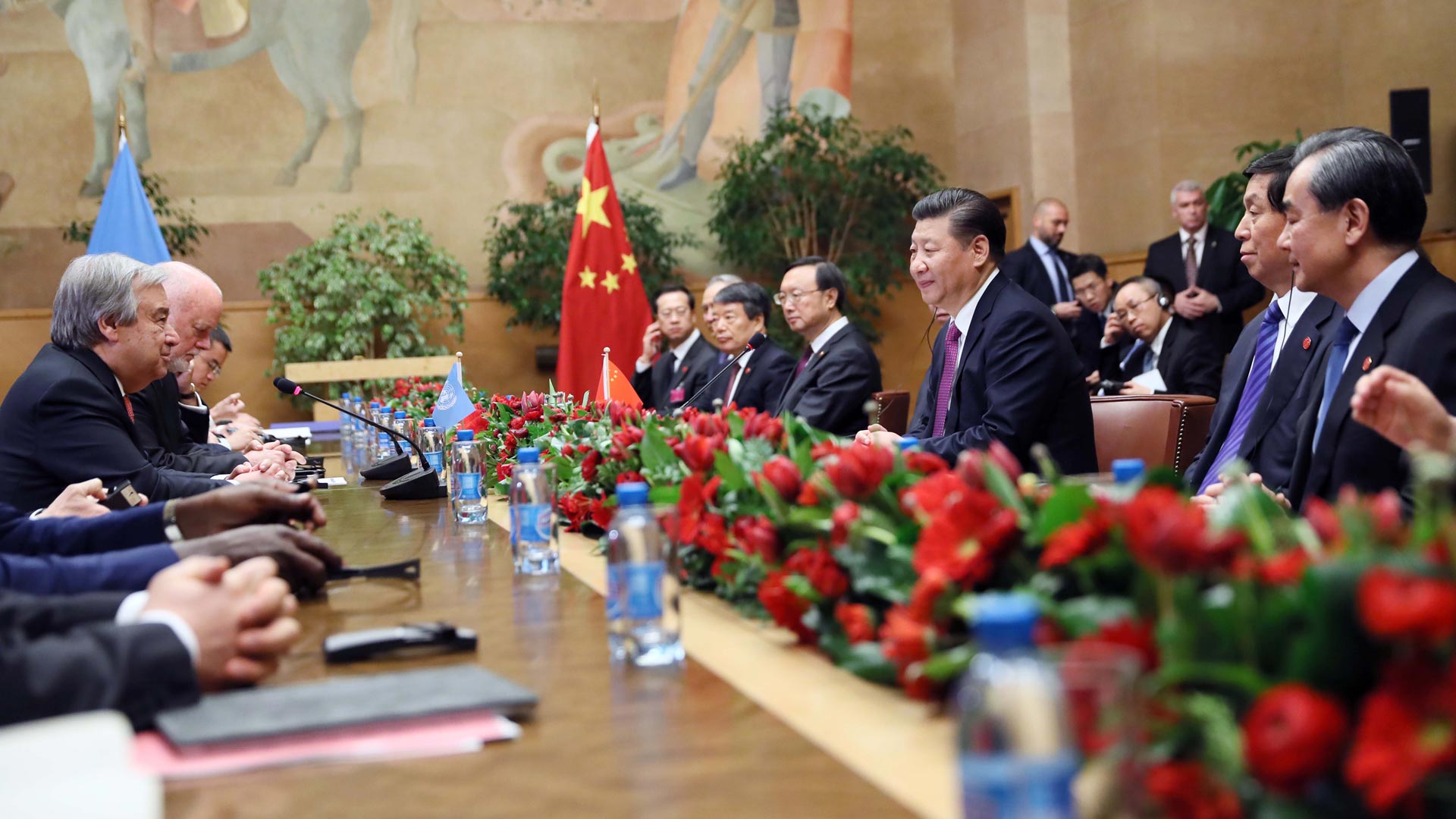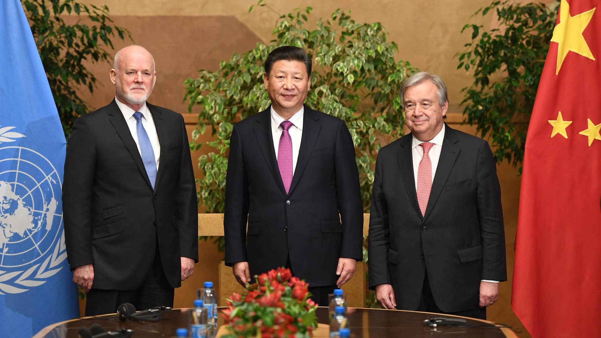 1月18日,國家主席習(xí)近平在瑞士日內(nèi)瓦萬國宮會(huì)見第71屆聯(lián)合國大會(huì)主席湯姆森和聯(lián)合國秘書長古特雷斯。 新華社記者 蘭紅光 攝2017-01-19