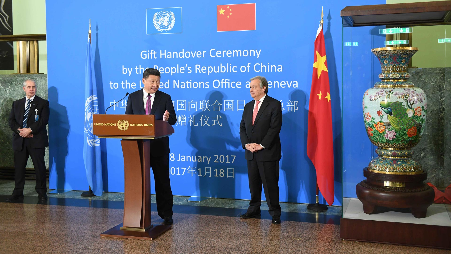 1月18日,國家主席習(xí)近平在瑞士日內(nèi)瓦萬國宮出席“共商共筑人類命運(yùn)共同體”高級(jí)別會(huì)議,并發(fā)表題為《共同構(gòu)建人類命運(yùn)共同體》的主旨演講。這是會(huì)議結(jié)束后,習(xí)近平出席中國向聯(lián)合國日內(nèi)瓦總部贈(zèng)禮儀式。新華社記者 張鐸 攝2017-01-19