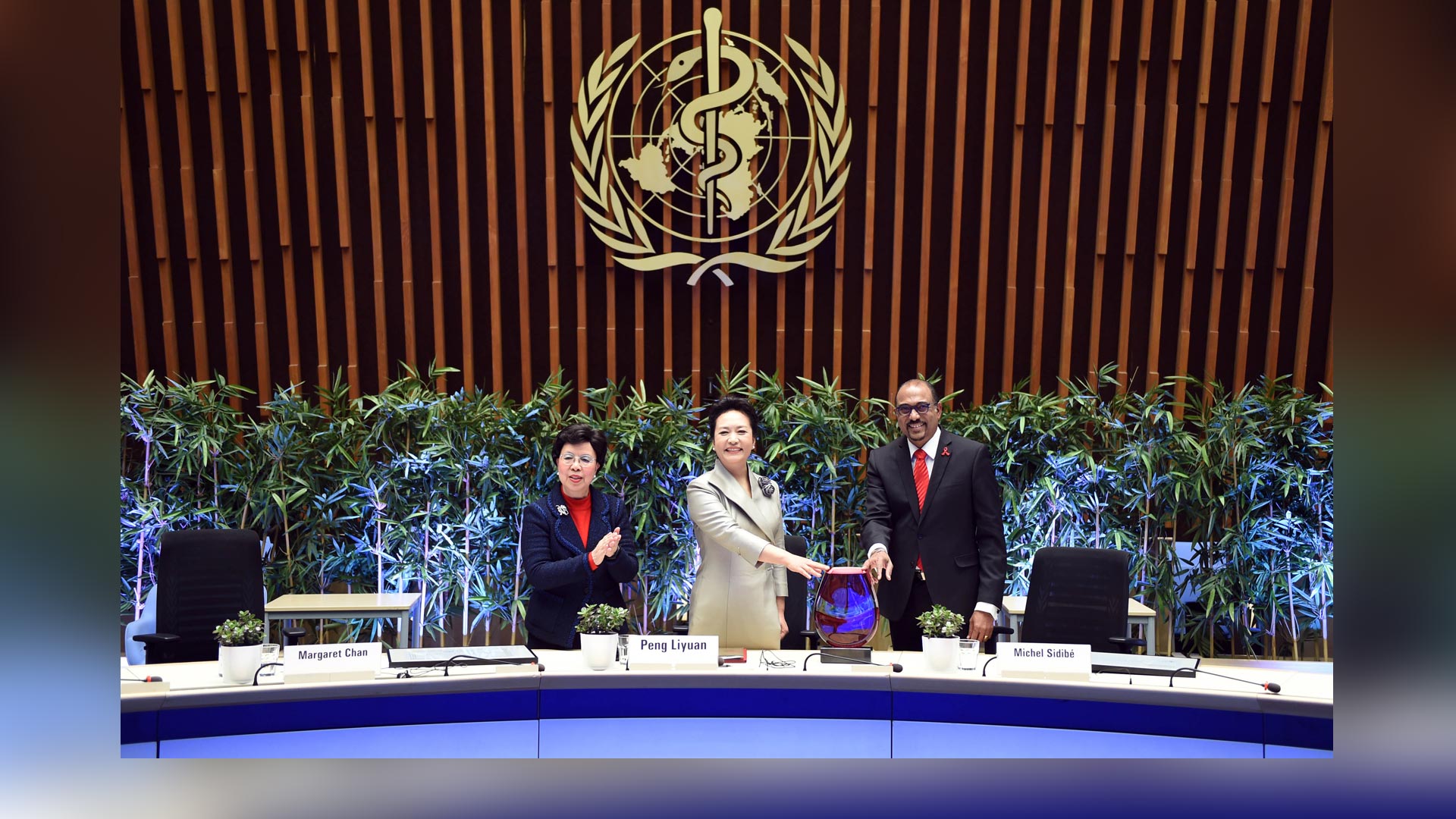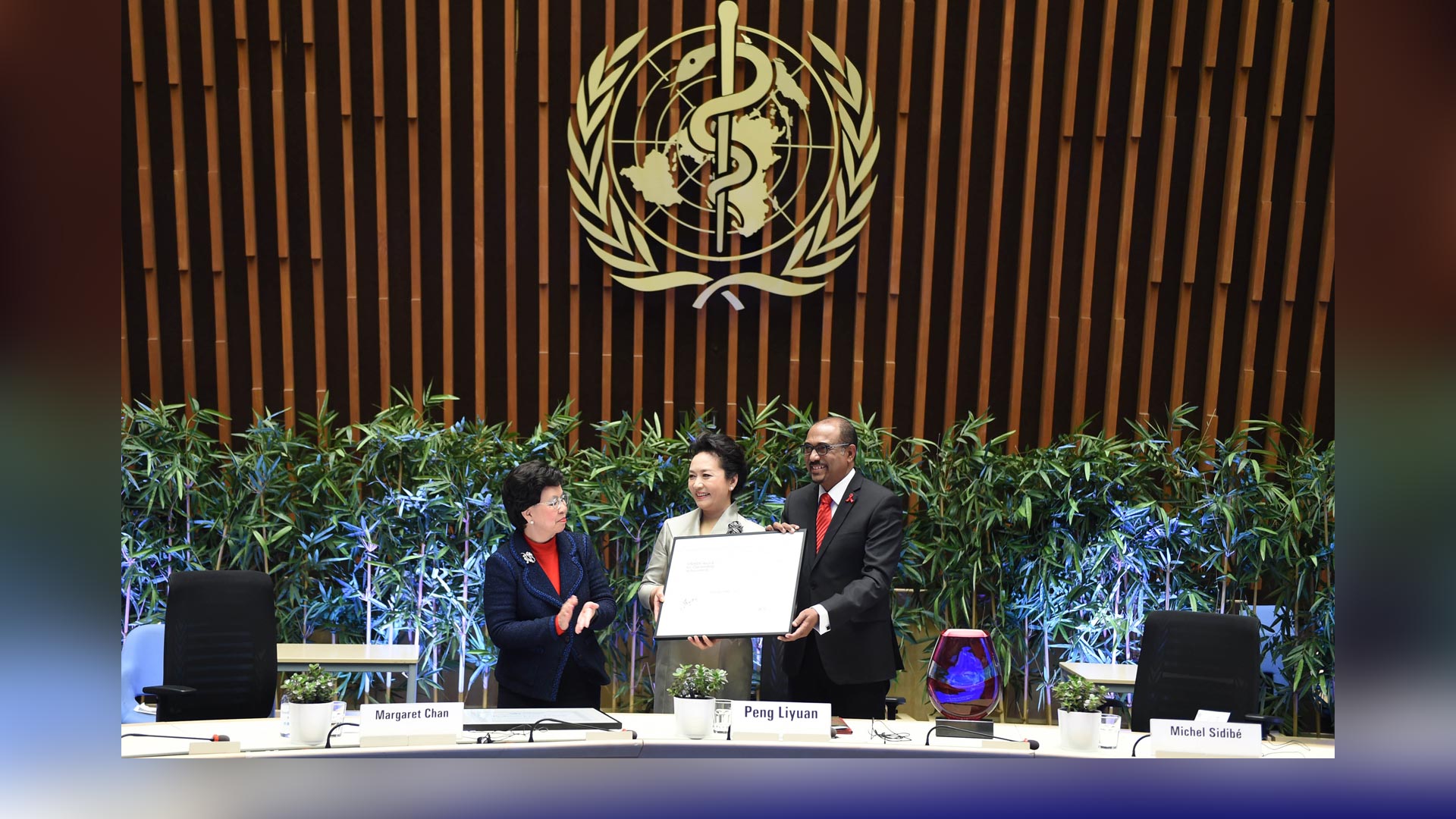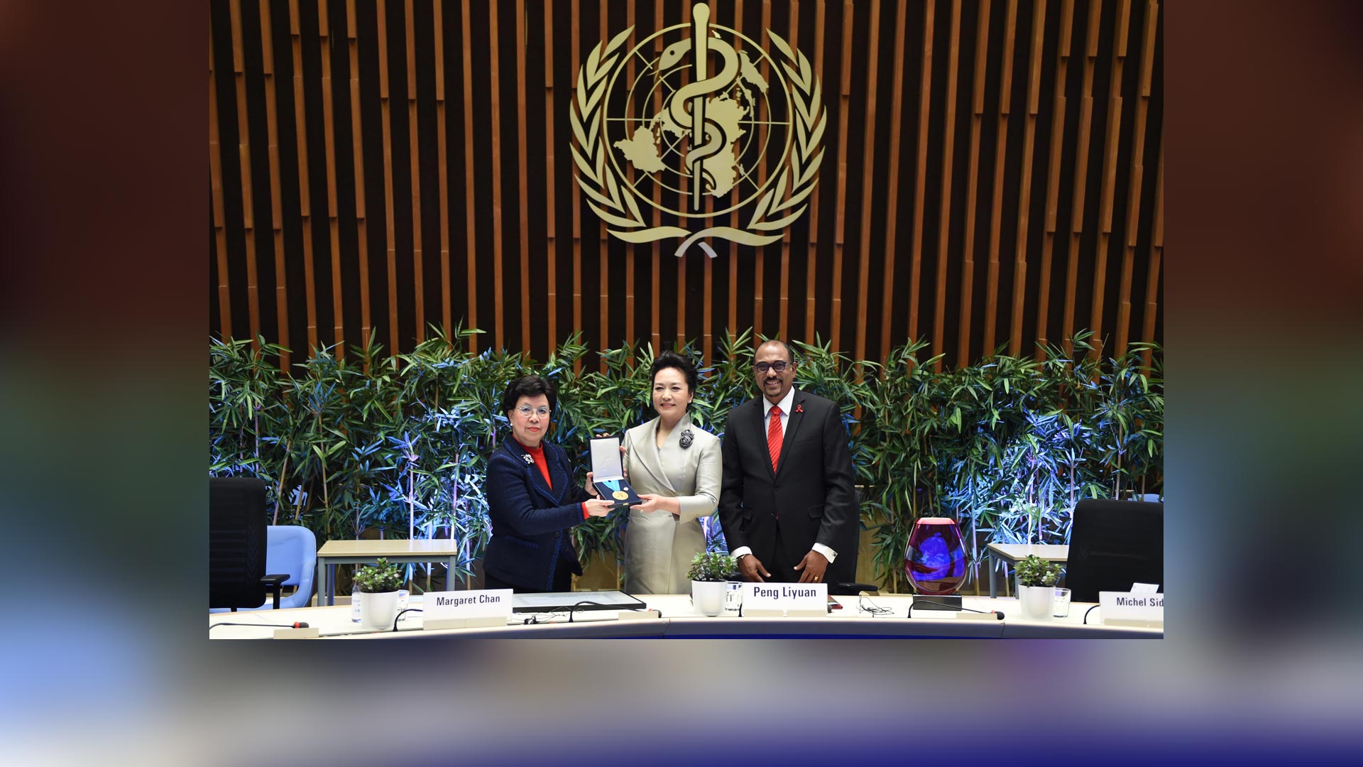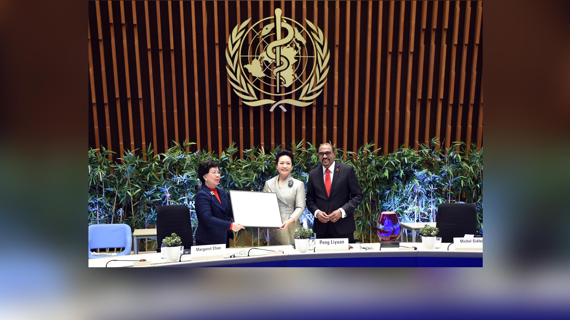 1月18日,國家主席習(xí)近平夫人、世界衛(wèi)生組織結(jié)核病和艾滋病防治親善大使彭麗媛應(yīng)世界衛(wèi)生組織總干事陳馮富珍和聯(lián)合國艾滋病規(guī)劃署執(zhí)行主任西迪貝邀請(qǐng),在瑞士日內(nèi)瓦出席為她舉行的親善大使任期續(xù)延暨頒獎(jiǎng)儀式。這是世界衛(wèi)生組織總干事陳馮富珍向彭麗媛頒發(fā)世衛(wèi)組織榮譽(yù)勛章。新華社記者謝環(huán)馳攝2017-01-19