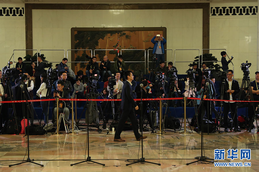 10月19日,“黨代表通道”第二場采訪活動在人民大會堂舉行。圖為現(xiàn)場媒體記者正在做采訪準(zhǔn)備。新華網(wǎng) 翟子赫 攝