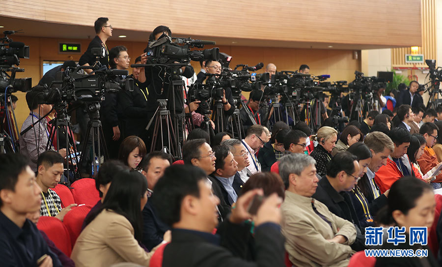 10月23日,十九大新聞中心舉辦記者招待會(huì),邀請中央財(cái)經(jīng)領(lǐng)導(dǎo)小組辦公室副主任楊偉民,環(huán)境保護(hù)部黨組書記、部長李干杰介紹踐行綠色發(fā)展理念,建設(shè)美麗中國有關(guān)情況,并回答記者提問。圖為現(xiàn)場記者。新華網(wǎng) 郝廣鵬攝