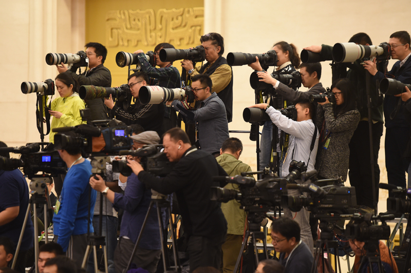 3月15日,國務院總理李克強在北京人民大會堂與中外記者見面,并回答記者提問。這是記者在采訪拍攝。 新華社記者陳曄華攝