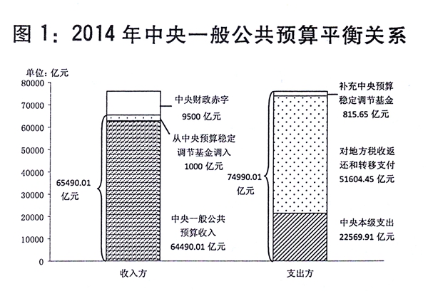 中央一般公共預算收入64490.01億元,為預算的100.2%,增長7.1%。加上從中央預算穩(wěn)定調節(jié)基金調入1000億元,使用的收入總量為65490.01億元。中央一般公共預算支出74174.36億元,完成預算的99.1%,增長8.3%(其中,中央本級支出22569.91億元,完成預算的100.3%,增長10.2%)。加上補充中央預算穩(wěn)定調節(jié)基金815.65億元,支出總量為74990.01億元。收支總量相抵,中央財政赤字9500億元,與預算持平。2014年末,中央財政國債余額95655.45億元,控制在年度預算限額100708.35億元以內;中央預算穩(wěn)定調節(jié)基金余額1341.15億元。