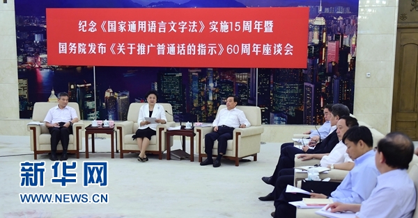 劉延?xùn)|在紀念《國家通用語言文字法》實施15周年暨國務(wù)院發(fā)布《關(guān)于推廣普通話的指示》60周年座談會上強調(diào)