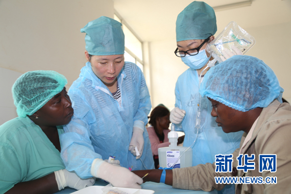 中國(guó)人民解放軍援助西非抗擊埃博拉疫情醫(yī)療隊(duì)為弗里敦中塞友好醫(yī)院開展輸液培訓(xùn)活動(dòng)(2014年12月10日攝)。新華社發(fā)(戴欣 攝)