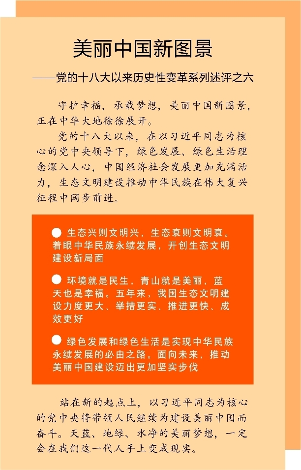 站在新的起點(diǎn)上,以習(xí)近平同志為核心的黨中央將帶領(lǐng)人民繼續(xù)為建設(shè)美麗中國而奮斗。天藍(lán)、地綠、水凈的美麗夢想,一定會在我們這一代人手上變成現(xiàn)實(shí)。