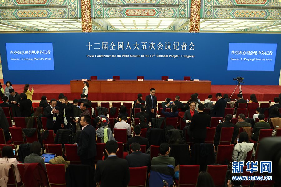 3月15日上午,國務(wù)院總理李克強(qiáng)在人民大會堂三樓金色大廳會見采訪十二屆全國人大五次會議的中外記者并回答記者提出的問題。圖為記者會現(xiàn)場。新華網(wǎng)/中國政府網(wǎng) 翟子赫 攝?