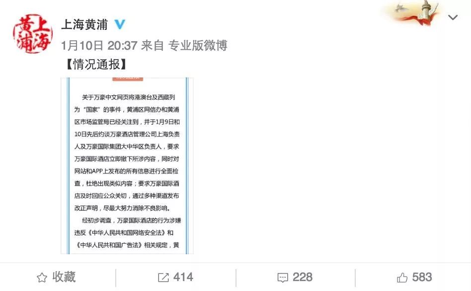 已經(jīng)約談萬豪酒店管理公司上海負責人及萬豪國際集團大中華區(qū)負責人,要求萬豪國際酒店立即撤下所涉內(nèi)容,同時對網(wǎng)站和APP上發(fā)布的所有信息進行全面檢查,杜絕出現(xiàn)類似內(nèi)容;