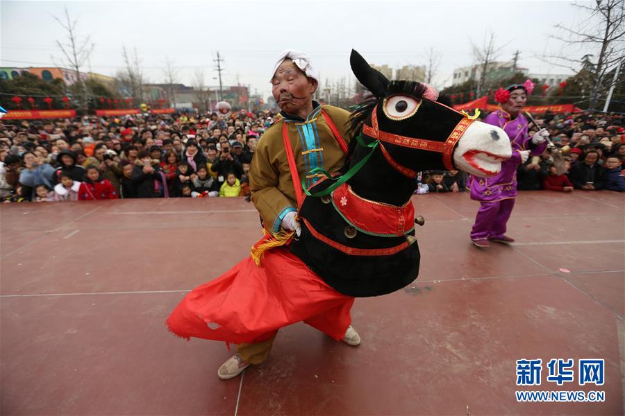 2月16日,在郯城縣人民廣場,民間藝人進行民俗表演。