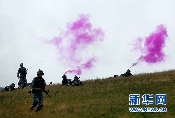 紅藍對抗中,殲“敵”信號發(fā)射后,“紅軍”主攻隊在模擬連連長指揮下,按照戰(zhàn)術編組發(fā)起進攻(資料照片)。新華社發(fā)(姚立 攝)