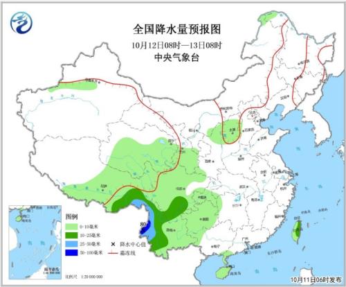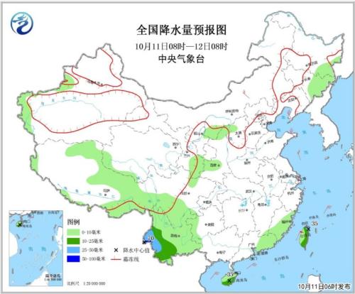 10月11日08時(shí)至12日08時(shí),黑龍江東南部、吉林東部、新疆西部、西藏北部和東部等地有小到中雨(雪)或雨夾雪;西北地區(qū)東部、四川南部、云南大部、貴州西部、華南東部、海南島和臺(tái)灣島等地部分地區(qū)有小到中雨,其中,云南西部、海南島南部、臺(tái)灣東北部等地局地有大雨或暴雨(50~70毫米)。內(nèi)蒙古中部、遼東半島、山東半島等地部分地區(qū)有4~6級(jí)風(fēng)。臺(tái)灣海峽將有7~8級(jí)、陣風(fēng)9級(jí)的東北風(fēng)。