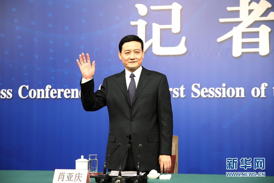 十三屆全國人大一次會(huì)議新聞中心3月10日15時(shí)在梅地亞中心多功能廳舉行記者會(huì),邀請(qǐng)國務(wù)院國資委主任肖亞慶,副秘書長(zhǎng)、新聞發(fā)言人彭華崗就“國有企業(yè)改革發(fā)展”相關(guān)問題回答中外記者提問。圖為肖亞慶向記者示意。新華網(wǎng)/中國政府網(wǎng) 翟子赫 攝