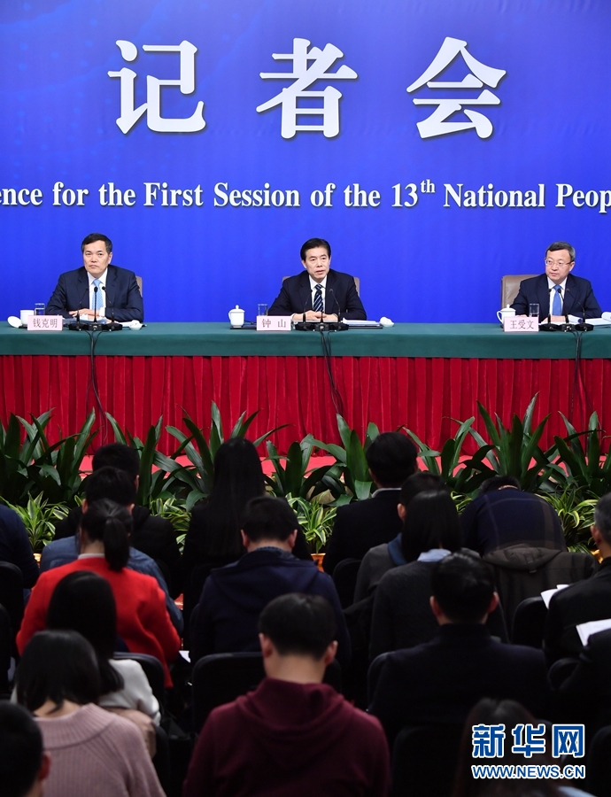3月11日,十三屆全國人大一次會議新聞中心舉行記者會,邀請商務部部長鐘山、副部長兼國際貿(mào)易談判副代表王受文、副部長錢克明就“推動形成全面開放新格局推動商務事業(yè)高質(zhì)量發(fā)展”相關(guān)問題回答中外記者提問。 新華社記者 李鑫 攝
