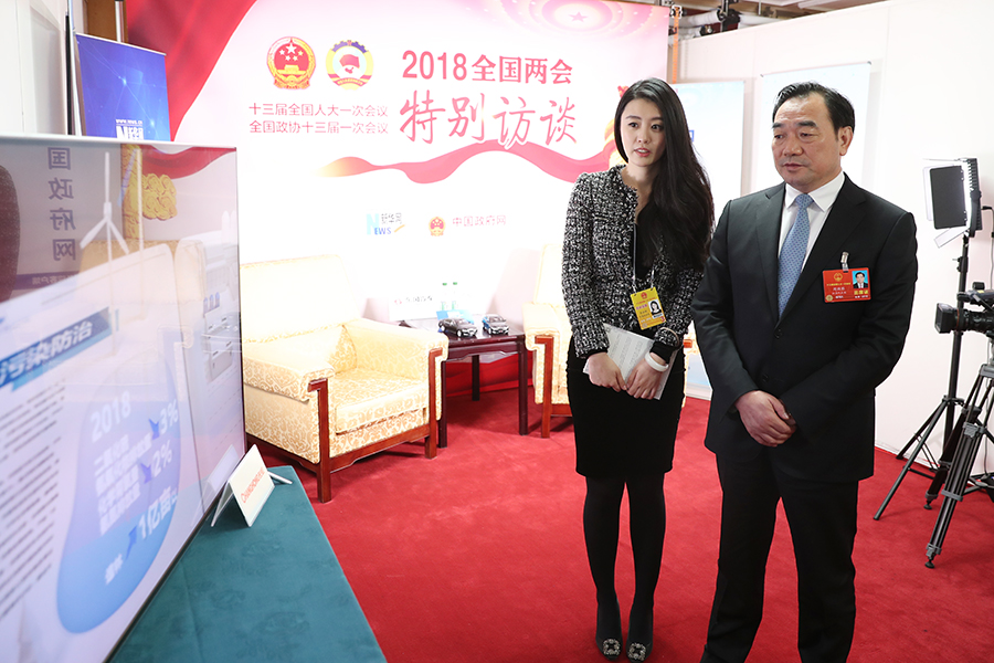 3月20日,全國人大代表、江蘇省徐州市市長周鐵根在新華網(wǎng)人民大會(huì)堂兩會(huì)特別訪談間內(nèi)觀看新華網(wǎng)創(chuàng)意視頻產(chǎn)品《躍然紙上看報(bào)告》。新華網(wǎng) 郝廣鵬 攝