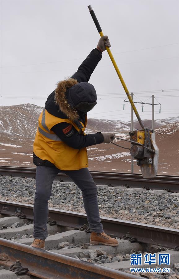 青藏鐵路唐古拉線路工人維修鐵軌(1月28日攝)。? 新華社記者 周健偉 攝