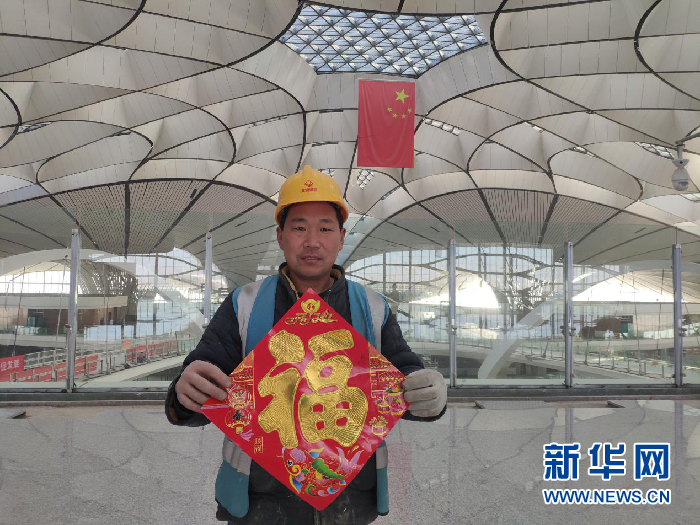 圖片說(shuō)明:大興機(jī)場(chǎng)航站樓春節(jié)期間值守的工人舉起了“?!弊?。 攝影:新華網(wǎng)錢春弦