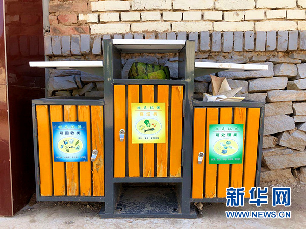 圖為小廟子村村民住房前的分類垃圾箱。新華網(wǎng)汪亞/攝