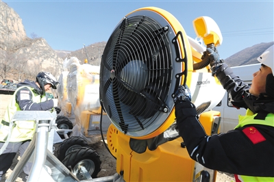 黃白相間的造雪機噴射出美麗的水霧,在空中迅速凝結(jié)為雪。圖片/北京市重大項目辦提供