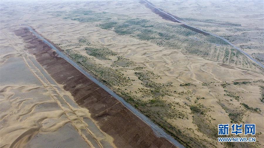 在新疆且末縣車爾臣河以東的防沙治沙綠色長廊,一條柏油路從沙漠中延伸,道路兩側(cè)綠意盎然(8月21日攝)。新華社記者 趙戈 攝