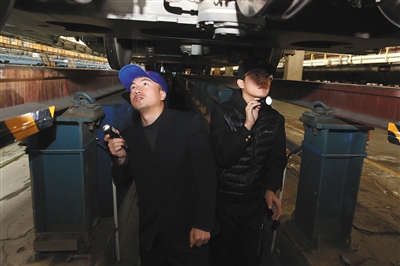 1月13日,北京動(dòng)車(chē)段南所,一級(jí)修車(chē)間高鐵機(jī)械師皮春成(左)和楊雪松(右)在檢查油跡。