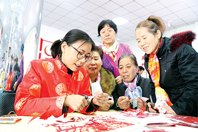 山東淄博市張店區(qū)開展“迎新春·情暖冬日”活動(dòng),組織機(jī)關(guān)干部教群眾剪窗花。