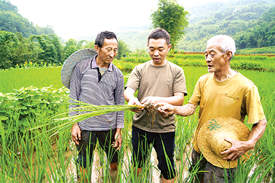 貴州赤水市組工干部、農(nóng)技干部幫助村民解決水稻病蟲害防治難題。