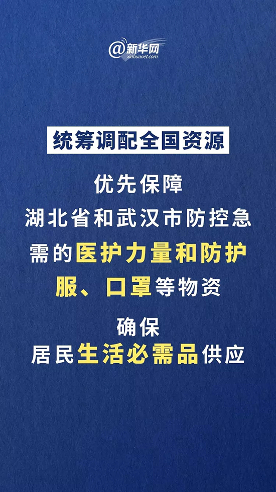 會議強調(diào),要突出重點,進(jìn)一步加強湖北省和武漢市疫情防控。中央向湖北派出指導(dǎo)組,推動加強防控一線工作。統(tǒng)籌調(diào)配全國資源,優(yōu)先保障湖北省和武漢市防控急需的醫(yī)護力量和防護服、口罩等物資,確保居民生活必需品供應(yīng),物資調(diào)運實行綠色通道。湖北省和武漢市要層層落實責(zé)任,加快建設(shè)集中收治醫(yī)院、改造酒店作為隔離區(qū),做好發(fā)熱病人及時診治,防范發(fā)生次生問題。加強醫(yī)護人員輪換和防護,緩解他們的身體和心理壓力。嚴(yán)格做好城鄉(xiāng)結(jié)合部、省市邊界人流進(jìn)出管理,做到外防輸出、內(nèi)防擴散。