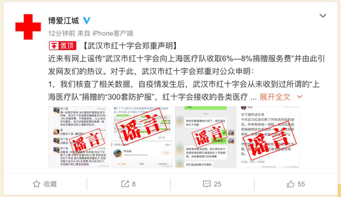 武漢市紅十字會(huì)呼吁廣大網(wǎng)友,不要讓謠言玷污了各界愛心企業(yè)和愛心人士的善意之舉,疫情面前,不信謠、不傳謠,眾志成城,共渡難關(guān)。