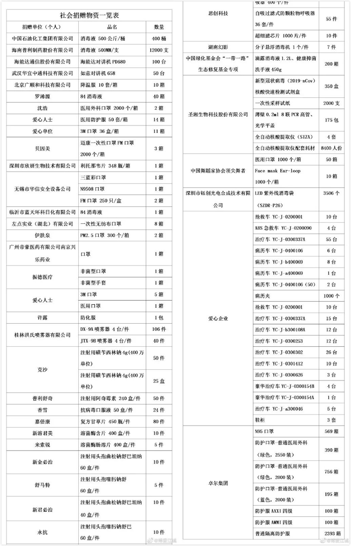 長安街知事(微信ID:Capitalnews)注意到,疫情發(fā)生以來,武漢紅十字會(huì)收到了大量社會(huì)捐贈(zèng)款物,并分3期公布了相關(guān)清單。