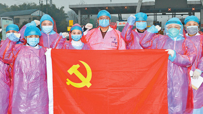2月5日,在湖南益陽(yáng)市高速公路鄧石橋出口,參與對(duì)乘車人進(jìn)行體溫監(jiān)測(cè)的康雅醫(yī)院黨員重溫入黨誓詞。為發(fā)揮黨員的模范帶頭作用,益陽(yáng)各交通要道路口、車站卡口工作人員成立了臨時(shí)黨支部,設(shè)立了黨員示范崗。宣國(guó)祥攝(人民視覺)