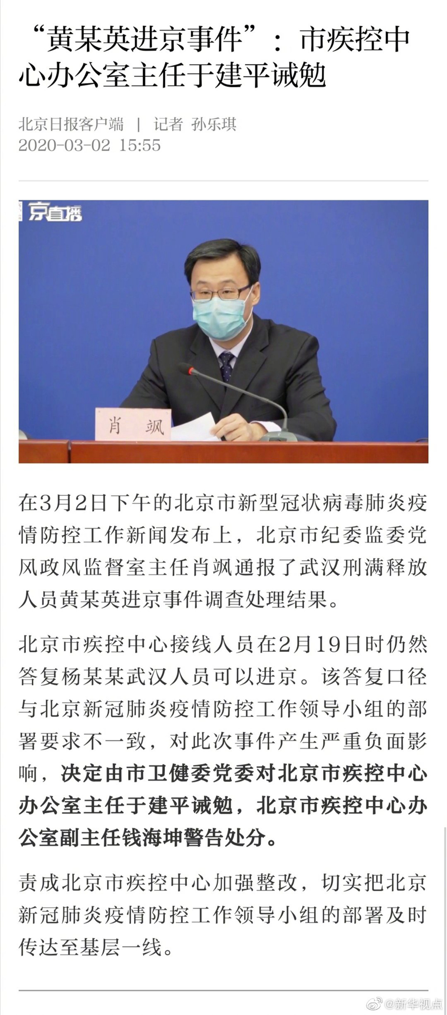 “黃某英進京事件”:北京市疾控中心辦公室主任于建平誡勉-新華網(wǎng)