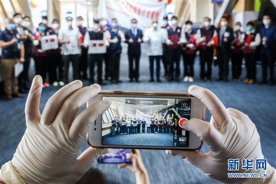 4月19日,在菲律賓馬尼拉機(jī)場(chǎng),中國(guó)援菲律賓抗疫醫(yī)療專(zhuān)家組成員在回國(guó)前合影留念。 新華社發(fā)(烏馬利攝)