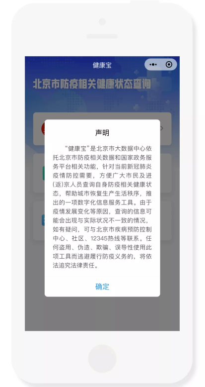 “健康寶”是北京市大數(shù)據(jù)中心依托北京市防疫相關(guān)數(shù)據(jù)和國家政務(wù)服務(wù)平臺(tái)相關(guān)功能,針對當(dāng)前新冠肺炎疫情防控需要,方便廣大市民及進(jìn)(返)京人員查詢自身防疫相關(guān)健康狀態(tài),幫助城市恢復(fù)生產(chǎn)生活秩序,推出的一項(xiàng)數(shù)字化信息服務(wù)工具。