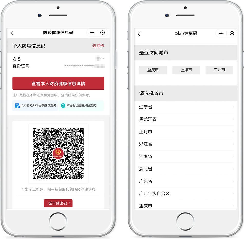 例如,上海、廣東、四川、湖北等地均可使用全國(guó)一體化平臺(tái)“防疫健康信息碼”作為防疫卡口核驗(yàn)的健康憑證。如有申領(lǐng)當(dāng)?shù)亍敖】荡a”的需要,你也可通過(guò)“防疫健康信息碼”頁(yè)面下方的“城市健康碼”進(jìn)行一鍵切換。