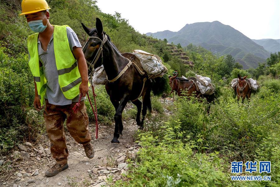 6月16日,在京西林場(chǎng),由于工程區(qū)路程較遠(yuǎn),山路陡峭,一名工人牽著幾匹騾子將樹(shù)苗運(yùn)上山。 新華社發(fā)(何建勇 攝)