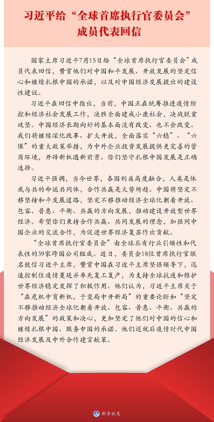 新華社北京7月16日電 國家主席習(xí)近平7月15日給“全球首席執(zhí)行官委員會”成員代表回信,贊賞他們對中國和平發(fā)展、開放發(fā)展的堅(jiān)定信心和繼續(xù)扎根中國的承諾,以及對中國經(jīng)濟(jì)發(fā)展提出的建設(shè)性建議。