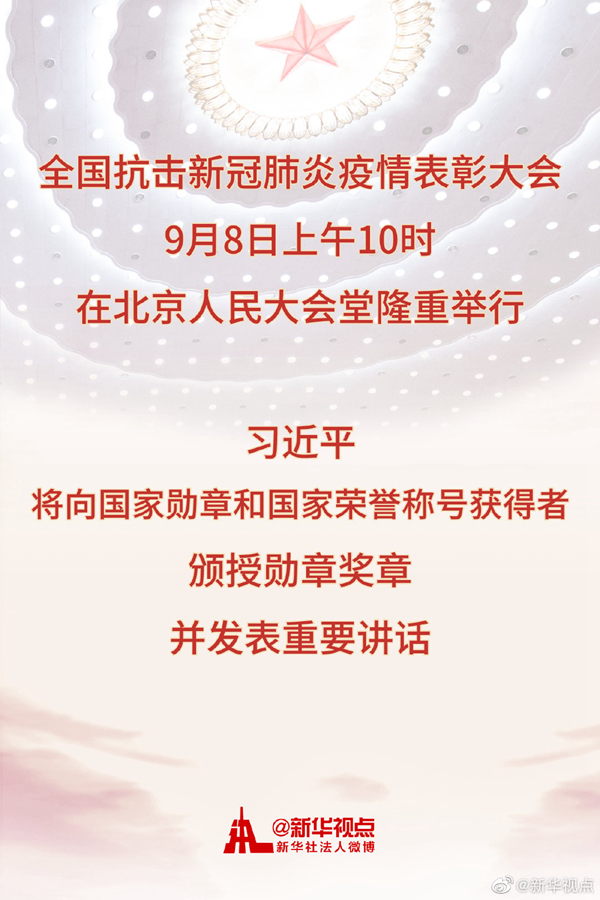 新華社北京9月6日電? 全國抗擊新冠肺炎疫情表彰大會將于9月8日上午10時在北京人民大會堂隆重舉行。中共中央總書記、國家主席、中央軍委主席習近平將向國家勛章和國家榮譽稱號獲得者頒授勛章獎章并發(fā)表重要講話。