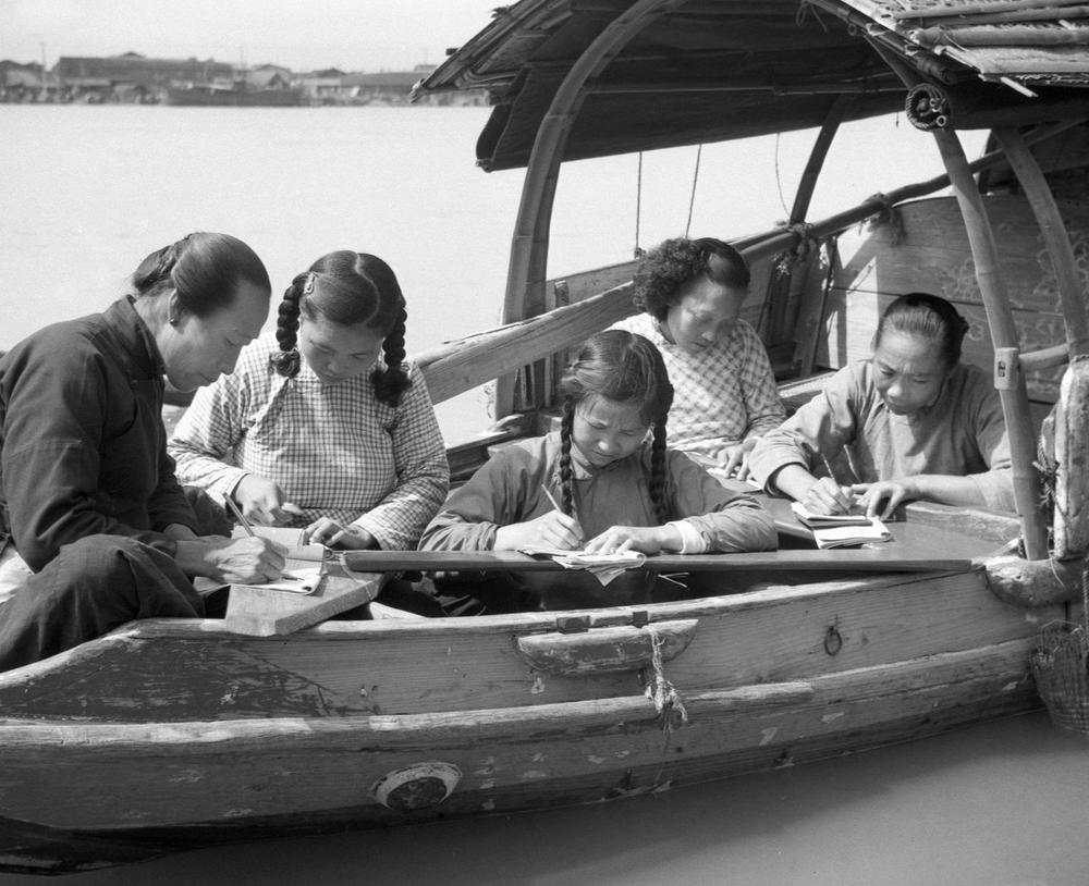 ↑ 1958年,福建省福州市生活在水上的婦女在船頭練習(xí)寫字。解放前,福州市的水上居民中婦女100%都是文盲。解放后,她們走進了識字班,在當(dāng)?shù)匦W(xué)教師的輔導(dǎo)下開展掃盲學(xué)習(xí)。