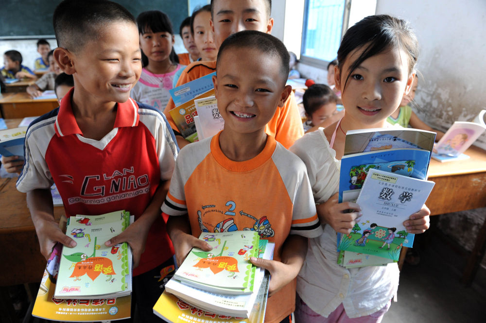↑ 這是2008年9月1日,江西樟樹市第二小學(xué)五(1)班鄧文?。ㄖ校┑韧瑢W(xué)領(lǐng)到免費教科書。
