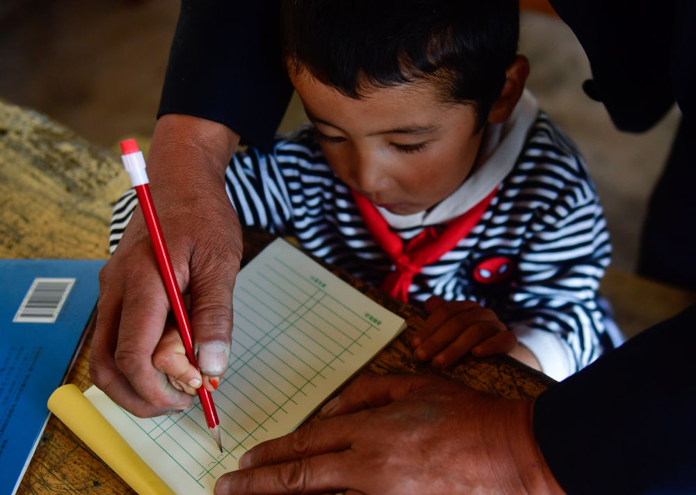 ↑ 2020年8月31日,在青海省海東市循化撒拉族自治縣白莊鎮(zhèn)來塘村學(xué)校,完么仁增老師在指導(dǎo)一年級學(xué)生馬文輝學(xué)習(xí)。