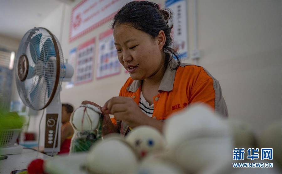 怒江傈僳族自治州福貢縣托坪易地扶貧搬遷集中安置點(diǎn),花六妹在村里的棒球扶貧車間工作(2019年9月17日攝)。新華社記者 江文耀 攝