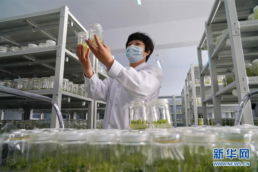 技術人員在張北縣德勝村無菌育種室內察看馬鈴薯瓶苗長勢。攝于2020年5月。新華社記者 牟宇 攝