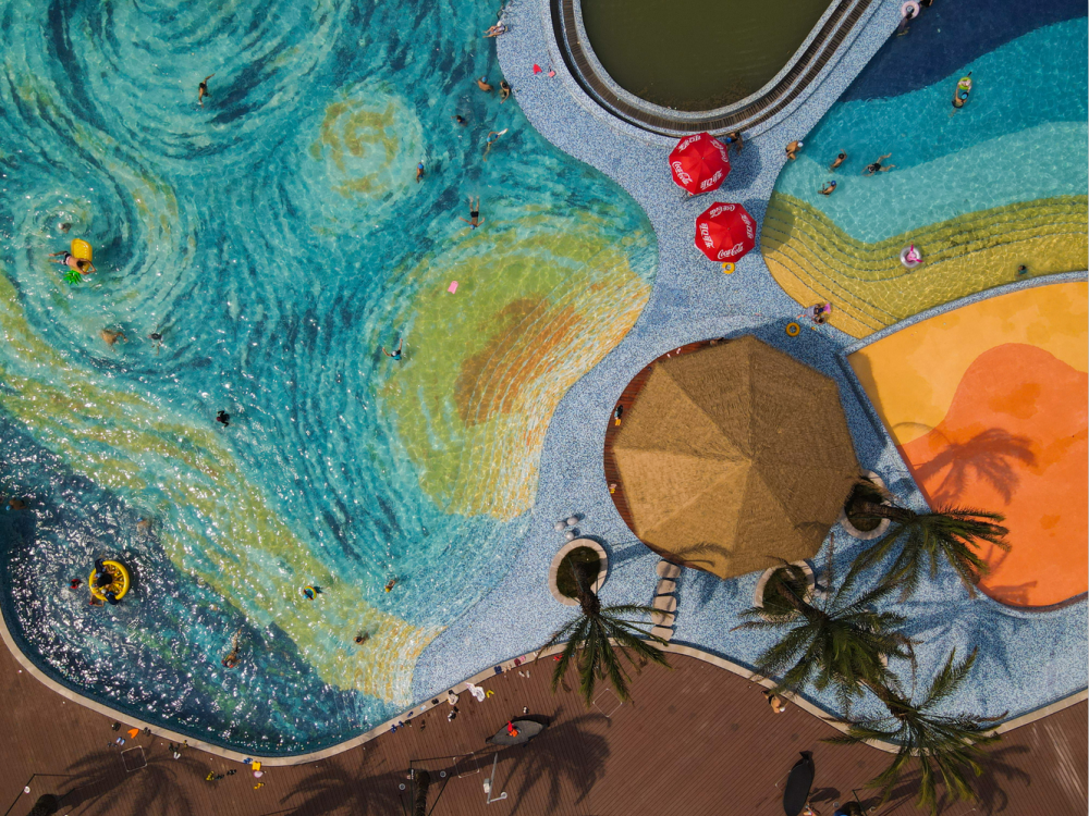 7月19日,成都江灘公園無(wú)邊泳池,因?yàn)橐哉蟾叩男强請(qǐng)D案為底,配上陽(yáng)光、沙灘、棕櫚樹、草亭等,讓人仿佛置身熱帶海灘