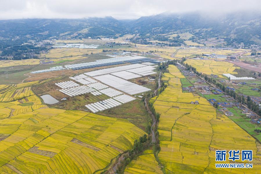昭覺(jué)縣阿并洛古鄉(xiāng)的美麗田園和農(nóng)業(yè)產(chǎn)業(yè)園(10月13日攝,無(wú)人機(jī)照片)。新華社記者 江宏景 攝
