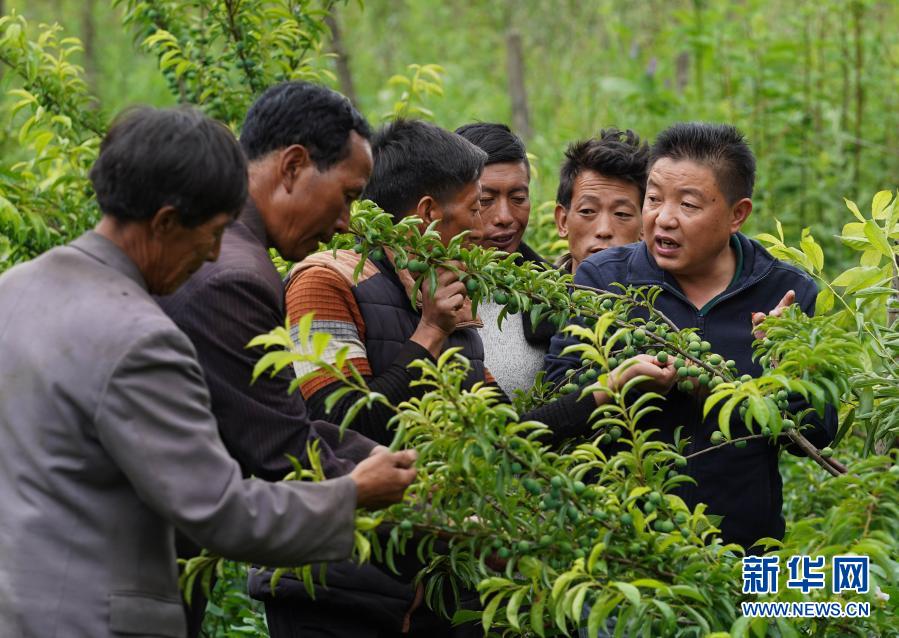 派駐到布拖縣覺(jué)撒鄉(xiāng)的幫扶干部楊永林(右一)在博作村帶領(lǐng)村民查看茵紅李掛果情況(6月22日攝)。新華社記者 江宏景 攝
