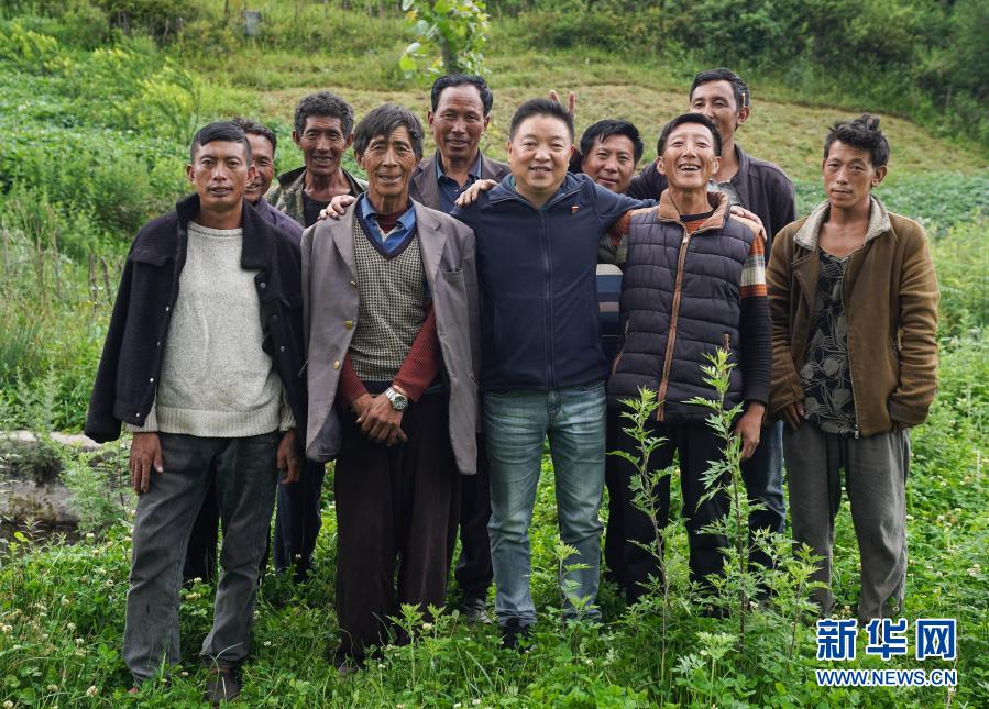 派駐到布拖縣覺(jué)撒鄉(xiāng)的幫扶干部楊永林(前排中)和博作村的彝族群眾合影(6月22日攝)。新華社記者 江宏景 攝