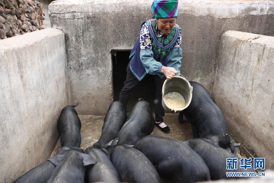 昭覺(jué)縣火普村建檔立卡貧困戶曲比子阿木在喂豬(5月11日攝)。新華社記者 江宏景 攝