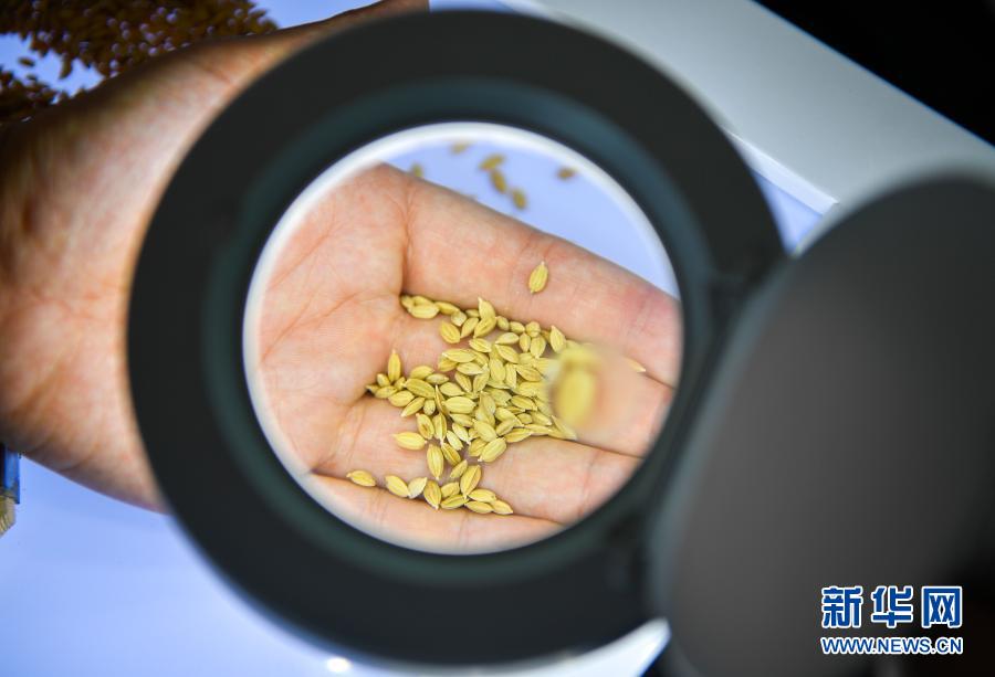 在吉林省吉林市永吉縣一拉溪鎮(zhèn)九月豐家庭農場,工作人員在實驗室中檢測一批試種水稻的稻谷外觀(8月12日攝)。新華社記者 許暢 攝
