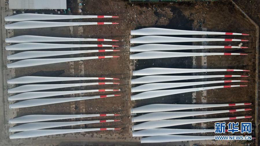 這是河北省威縣一家風電設施生產企業(yè)內的大型風電機組葉片(12月8日攝,無人機照片)。新華社記者 牟宇 攝