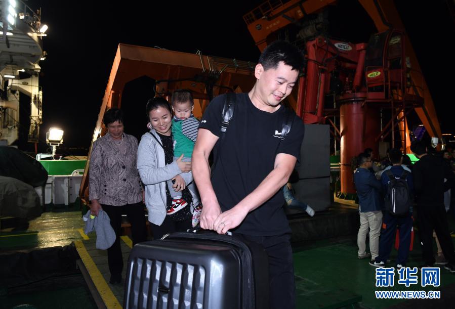 12月21日,“奮斗者”號(hào)海試保障母船“探索二號(hào)”靠泊三亞,科考隊(duì)員和前來迎接的家屬一起離船。新華社記者 趙穎全 攝